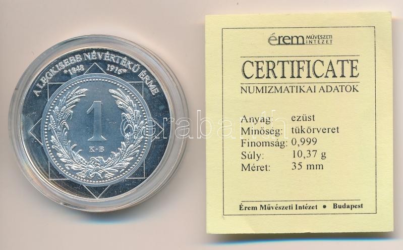 DN "A magyar nemzet pénzérméi - A legkisebb névértékű érme 1848-1916" Ag emlékérem tanúsítvánnyal (10,37g/0,999/35mm) T:PP felületi k., fo.
