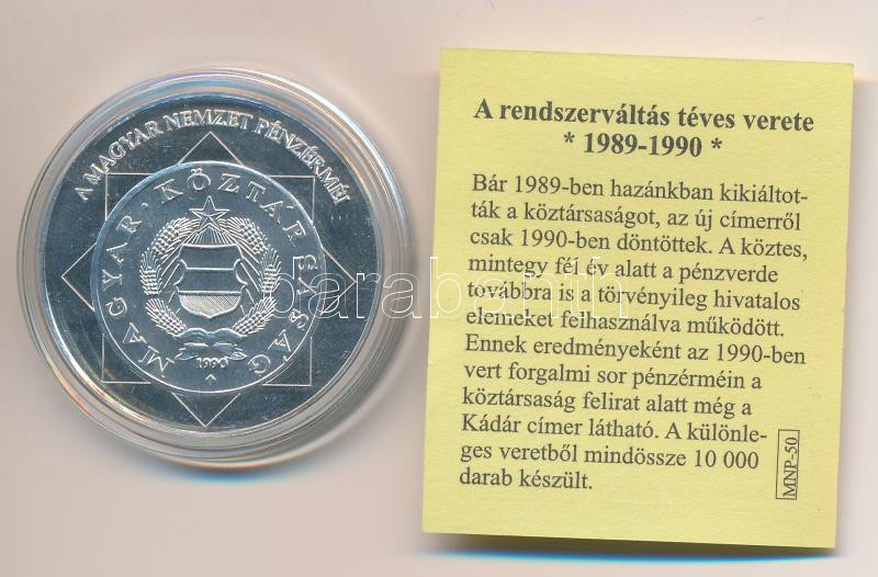 DN "A magyar nemzet pénzérméi - A rendszerváltás téves verete 1989-1990" Ag emlékérem tanúsítvánnyal (10,37g/0.999/35mm) T:PP