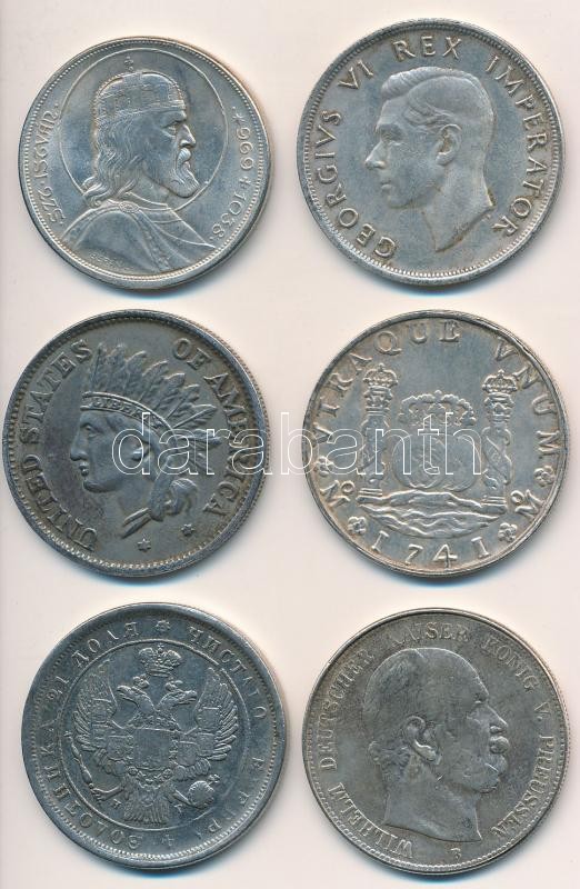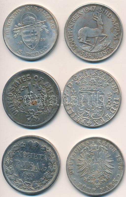 6db-os vegyes replika tétel, közte 1938. 5P Fe replika, Amerikai Egyesült Államok 1851. 1$ Fe replika, Dél-Afrika 5Sch Fe replika T:2,2- 6pcs of replica coins, including Hungary 1938. 5 Pengő Fe replica, USA 1851. 1 Dollar Fe replica, South Africa 5 Schilling Fe replica C:XF,VF