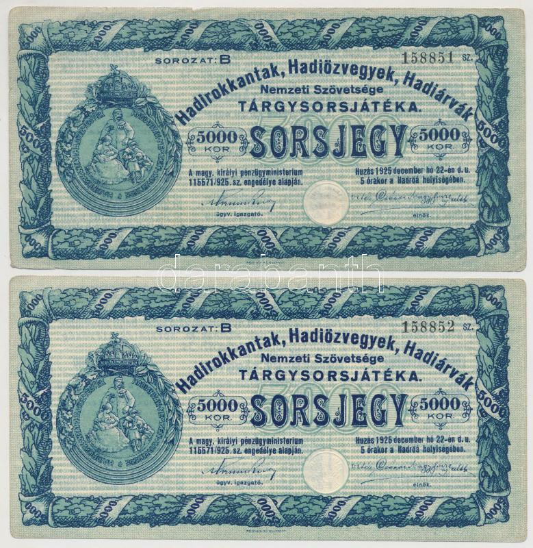 1925. "Hadirokkantak, Hadiözvegyek, Hadiárvák Nemzeti Szövetsége Tárgysorsjátéka" sorsjegy 5000K-ról, szárazpecséttel (2x) sorszámkövetők T:III