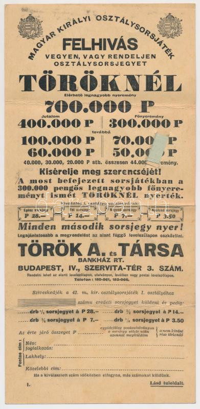 ~1939. "Török A. és Társa Bankház Rt. - Magyar Királyi Osztálysorsjáték" felhívás 3db szelvénnyel