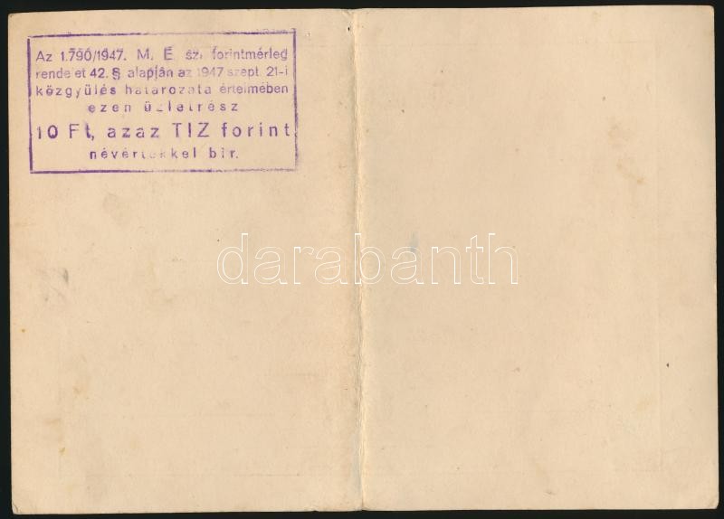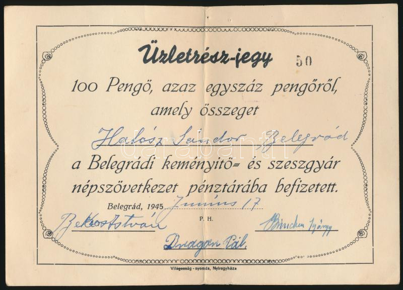 https://www.darabanth.com/en/271-Online-auction/271.0/Numismatics/Shares-and-Tickets~300005/Belegrad-1945-Belegradi-Kemenyito-es-Szeszgyar-Nepszovetkezet-100P-uzletresz-jegy-fe~II1343600