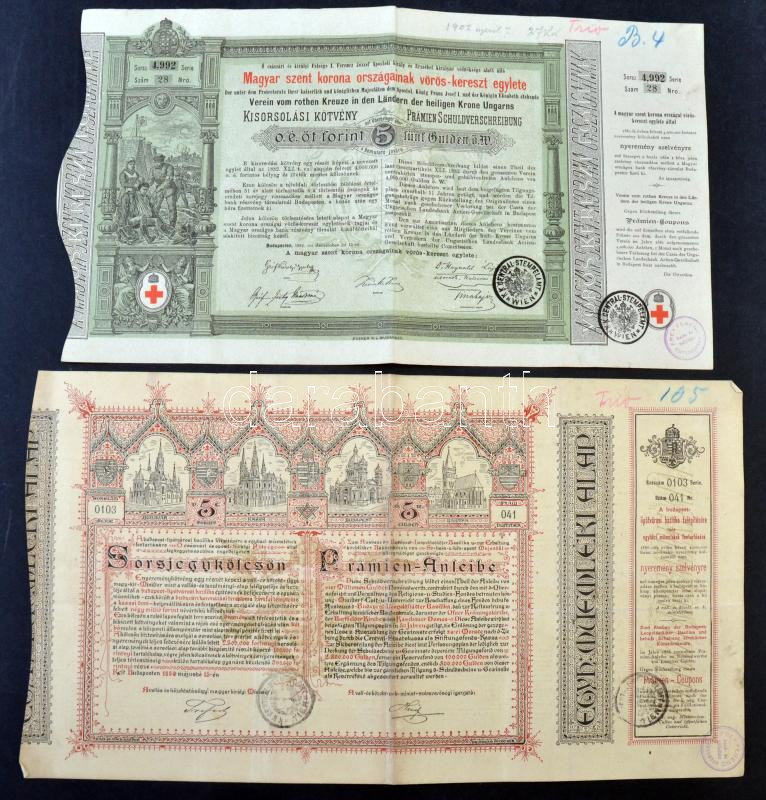 Budapest 1882. "Magyar szent korona országainak vörös-kereszt egylete" kisorsolási kötvény 5Ft-ról bélyegzésekkel, közte "Frey Ferenc bank- és váltóház Esztergomban" bélyegzése + 1886. "Egyházi Műemlék Alap" Sorsjegykölcsönök 5Ft-ról a budapest-lipótvárosi bazilika kiépítésére s egyházi műemlékek fenntartására felülbélyegzésekkel, közte "Frey Ferenc bank- és váltóház Esztergomban" bélyegzése T:III