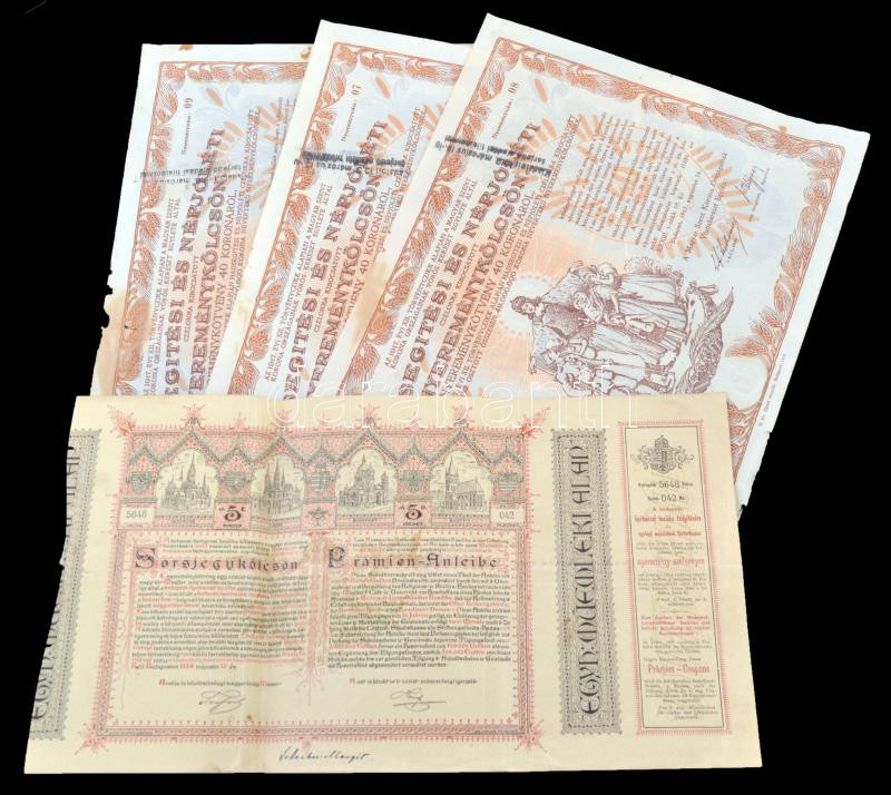 Budapest 1886. "Egyházi Műemlék Alap" Sorsjegykölcsönök 5Ft-ról a budapest-lipótvárosi bazilika kiépítésére s egyházi műemlékek fenntartására felülbélyegzésekkel + Budapest 1917. "Hadsegítési és Népjóléti nyereménykölcsön" nyereménykötvény 40K-ról, szárazpecséttel, felülbélyegzéssel, (3x) sorszámkövetők T:II-,III szakadások, lyukak