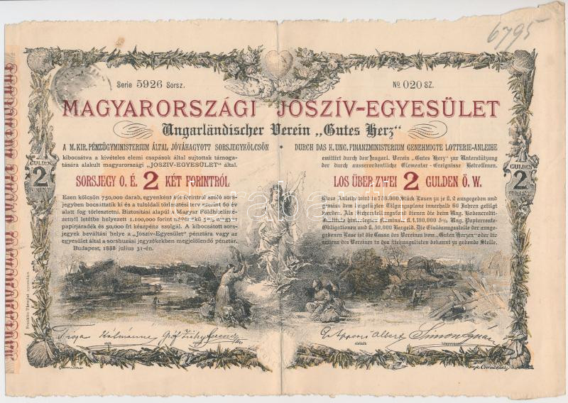 Budapest 1888. "Magyarországi Jószív-Egyesület" sorsjegykölcsön 2Ft-ról, szárazpecséttel, bélyegzésekkel (2x) sorszámkövetők T:II-,III