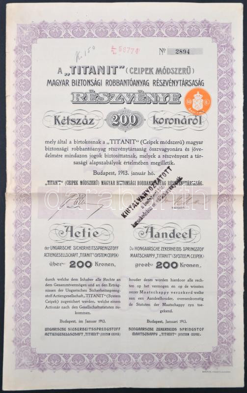 Description: Budapest 1913. " A 'Titanit' (Ceipek módszerű) Magyar Biztonsági Robbantóanyag Részvénytársaság" részvénye 200K-ról szelvényekkel, bélyegzésekkel, szárazpecséttel T:III