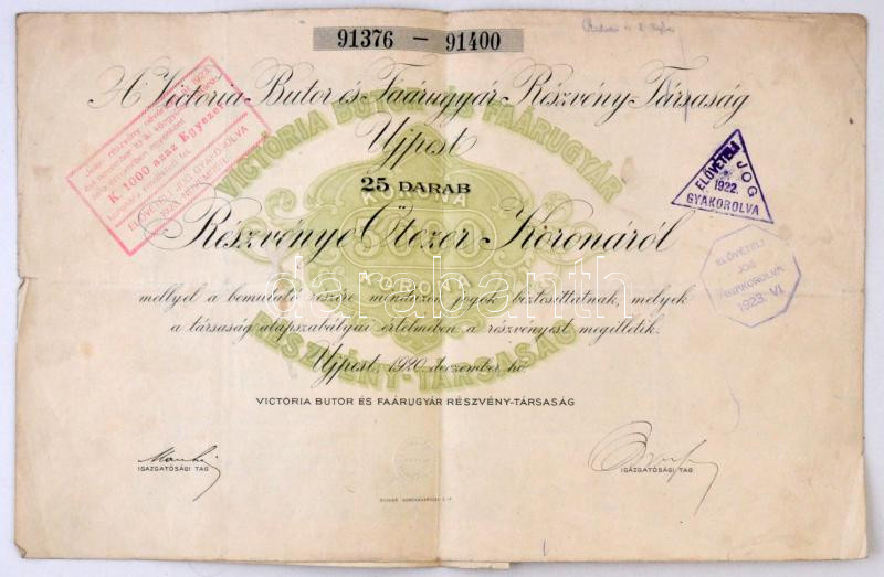 Description: Budapest 1920. "A Victoria Butor és Faárugyár Részvénytársaság Ujpest" 25db részvénye összesen 5.000K-ról szelvényekkel , bélyegzésekkel T:III kis szakadás