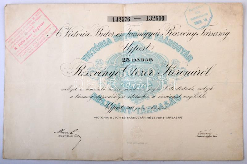 Budapest 1922. "A Victoria Butor és Faárugyár Részvénytársaság Uj... https://www.darabanth.com/en/271-Online-auction/271.0/Numismatics/Shares-and-Tickets~300005/Budapest-1922-A-Victoria-Butor-es-Faarugyar-Reszvenytarsasag-Ujpest-25db-reszvenye-ossz~II1373139
