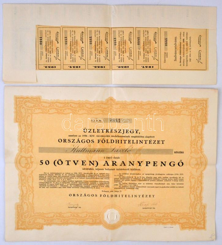 https://www.darabanth.com/en/271-Online-auction/271.0/Numismatics/Shares-and-Tickets~300005/Budapest-1936-Orszagos-Foldhitelintezet-1db-uzletreszjegye-50-aranypengorol-szelvenyekkel~II1373213