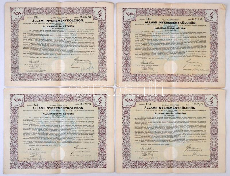 Budapest 1941. "4%-kal kamatozó Állami Nyereménykölcsön" államadóssági kötvény 1/4 részkötvénye 50P-ről szelvényekkel, szárazpecséttel (4x) megegyező sorszám, eltérő betűjelek T:III egyik szakadt