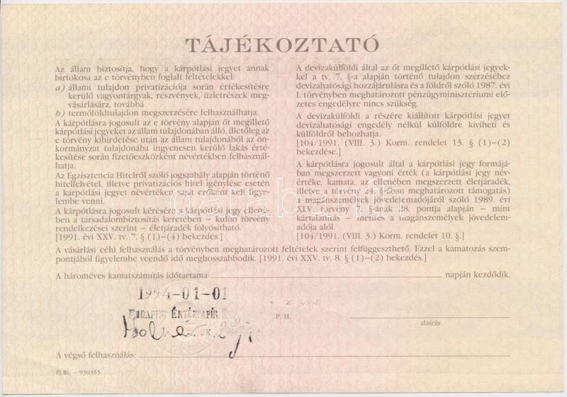 Budapest 1991. "Országos Kárrendezési és Kárpótlási Hivatal" kárpótlási jegye 1000Ft-ról (3x), "G" sorozat, szárazpecséttel, sorszámkövetők T:I-,II