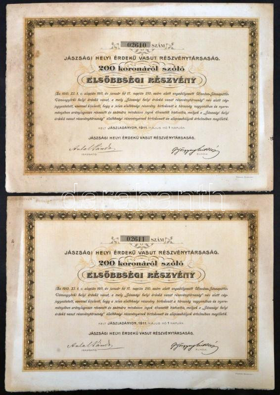 Jászladány 1911. "Jászsági Helyi Érdekű Vasút Részvénytársaság" 200K-ról szóló elsőbbségi részvények (2x) sorszámkövetők T:II folt