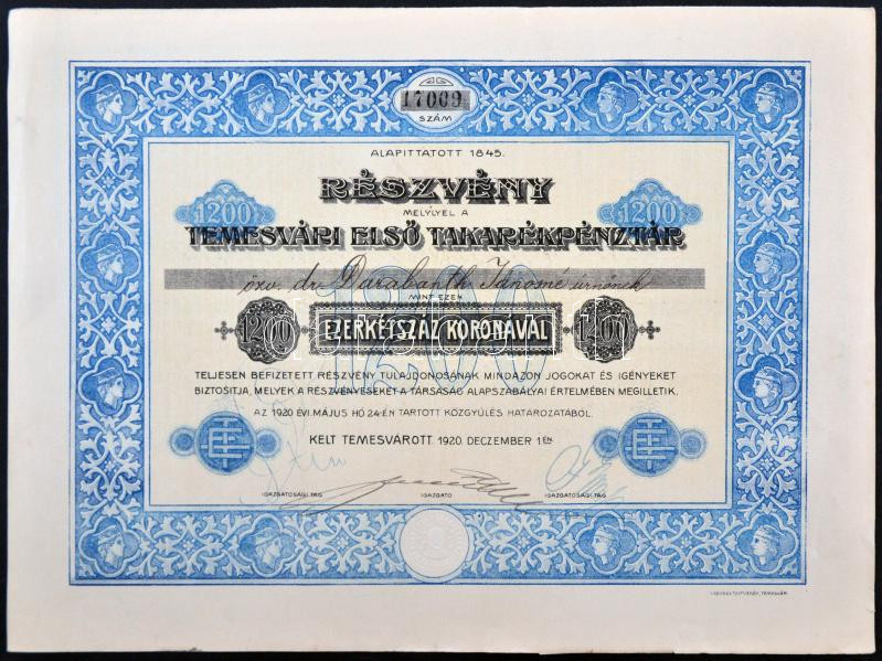 https://www.darabanth.com/en/271-Online-auction/271.0/Numismatics/Shares-and-Tickets~300005/Temesvar-1920-Temesvari-Elso-Takarekpenztar-reszvenye-1200K-rol-szelvenyekkel-TII~II1356010