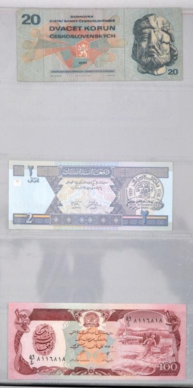 Description: Vegyes 75db-os bankjegy világgyűjtemény országok szerint rendezve, közte kanadai, afgán bankjegyek is, négygyűrűs mappában papírpénz berakó lapokon T:I-III