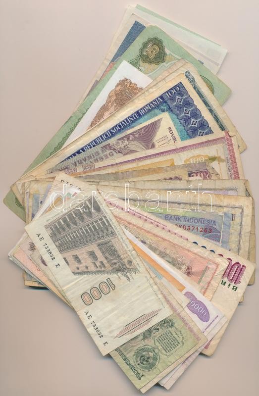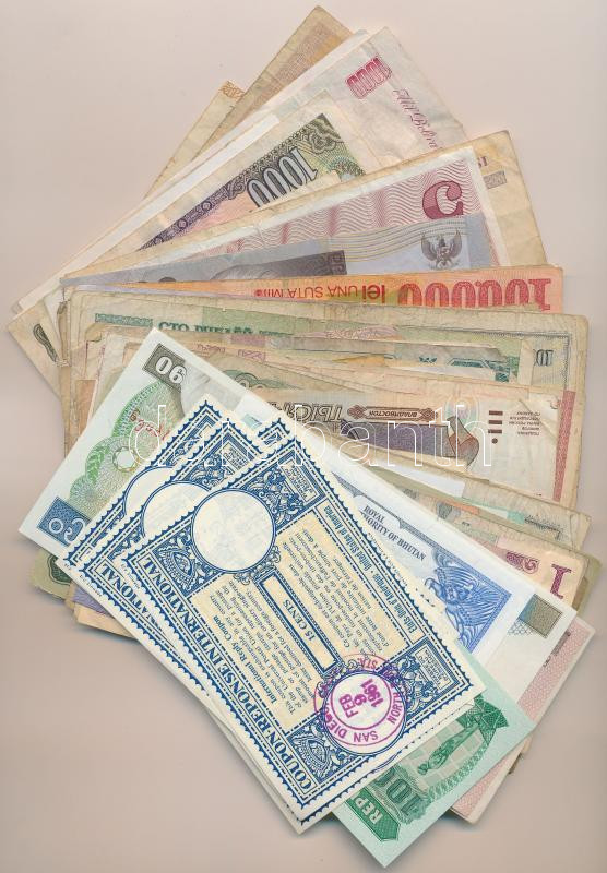 Vegyes bankjegy tétel a világ minden tájáról, több Európán kívüli országból, közte mozambiki, brazil, burmai és bhutáni bankjegyek is (~100x) + UPU bárcák (5x) T:I-III Mixed lot of banknotes from all around the world, many notes from outside Europe, including Mozambique, Brasilian, Burmese andBhutan banknotes (~100x) + UPU tokens for postage fees (5x) C:UNC-F