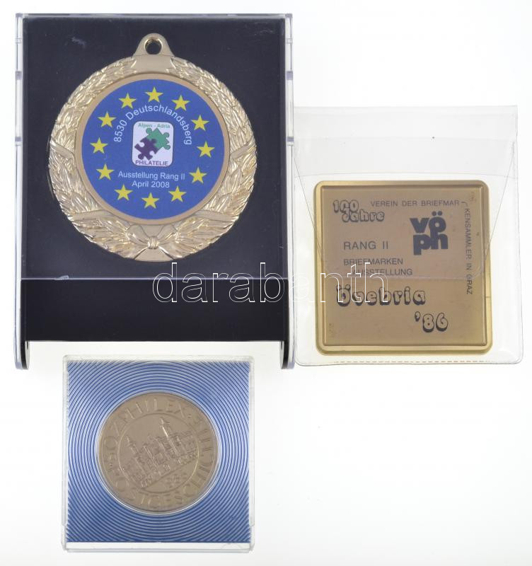 Ausztria 1986. "100 éves a Grazi Bélyeggyűjtő Egyesület" Br plakett (59x59mm) + 2008. "Deutschlandsberg - Alpok-Adria Bélyegkiállítás" német nyelvű emlékérem, füllel, eredeti tokban (68mm) + NDK 1985. "SOZPHILEX (Szocialista Bélyeg Kiállítás) Postatörténet / Bélyeggyűjtő Egyesület az NDK Kulturális Szövetségében" kétoldalas Br emlékérem (40mm) T:1-,2 Austria 1986. "100th Anniversary of the Philatelic Society of Graz" German language Br plaque (59x59mm) + 2008. "Deutschlandsberg Alpen-Adria Philatelie" German language commemorative medal with ear, in original case (68mm) + GDR 1985. "SOZPHILEX (Socialist Philatelic Exhibition) Post History / Philatelic Association in the GDR Cultural Alliance" German language double side Br commemorative medal (40mm) C:AU,XF