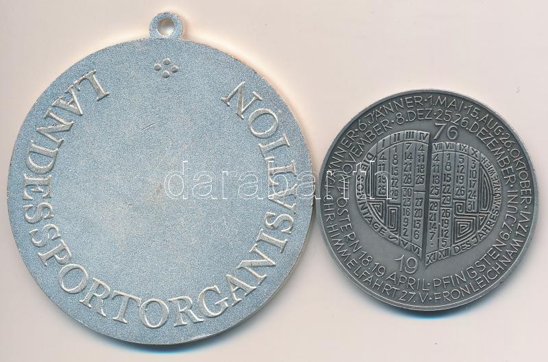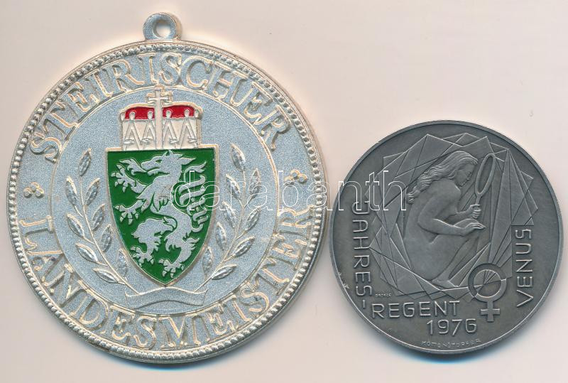 Ausztria DN "Stájer Nemzeti Bajnok / Nemzeti Sportszervezet" zománcozott, ezüstözött fém emlékérem, mellszalag nélkül (55mm) + Ausztria 1976. "Vénusz - Naptár 1976" ezüstözött Br naptárérem. Szign.: Köttenstrofer (40mm) T:2 egyiken kis ph. Austria ND "Steierischer Landesmeister - Landessportorganisation" enamelled, silverplated commmemorative medallion without ribbon (55mm) + Austria 1976. "Venus - Jahres-regent 1976" silver plated Br calendar medallion. Sign.: Köttenstrofer (40mm) C:XF, one of them with small edge error