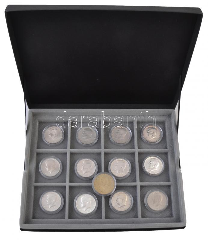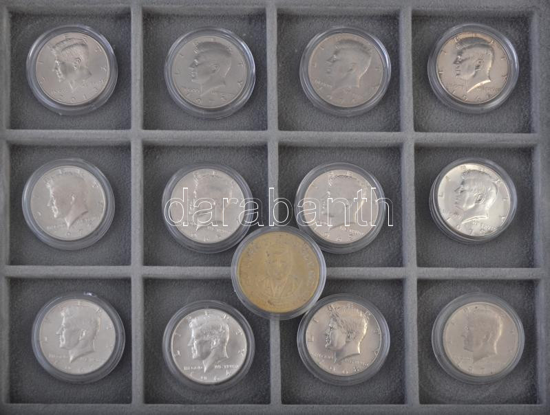 Amerikai Egyesült Államok 1964-1970S 1/2$ Ag "Kennedy" 6xklf évszám + 1971D-2013P 1/2$ Cu-Ni "Kennedy" 5xklf évszám + 1963. "John F. Kennedy - az Egyesült Államok 35. elnöke" kétoldalas fém emlékérem. Az érmek használt, tálca nélküli érmetartó dobozban T:2,2-