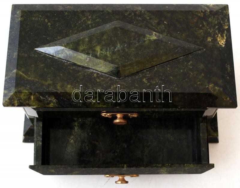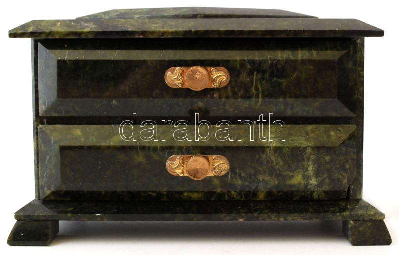 Ékszertartó szekrényke, csiszolt szerpentin, réz veretekkel, apró lepattanással, 18×9 cm, m:10 cm