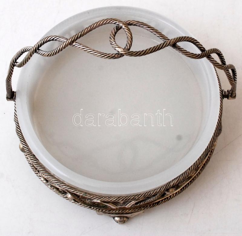 Jelzett angol ezüstözött füles kínáló, tejüveg betéttel, hibátlan, m:11 cm, d:13 cm
