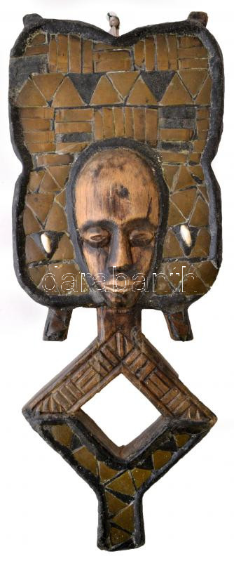 Törzsi dísztárgy: Afrikai fafaragvány, rézlapokkal és csonttal díszítve. / African tribal ornament with copper plates 20x46 cm