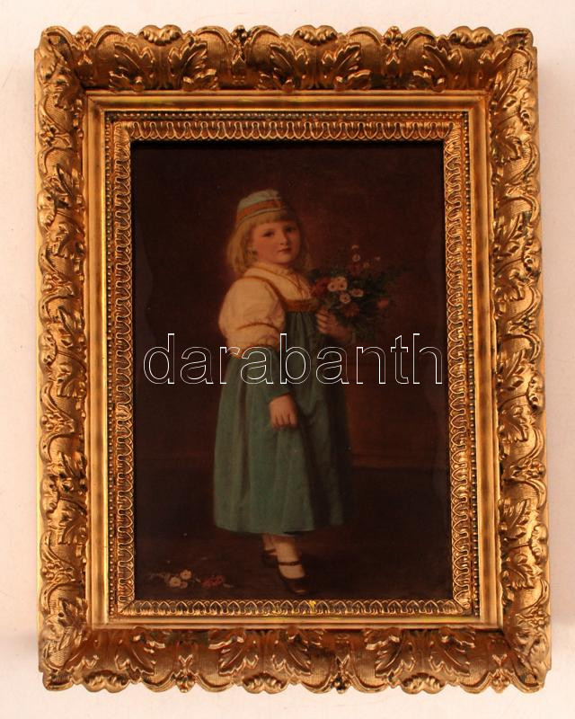 cca 1880 Kislány virágcsokorral. Chromotipia, festő: Nathanael Schmitt, üvegezett keretben, üvegen repedés, 27×20 cm