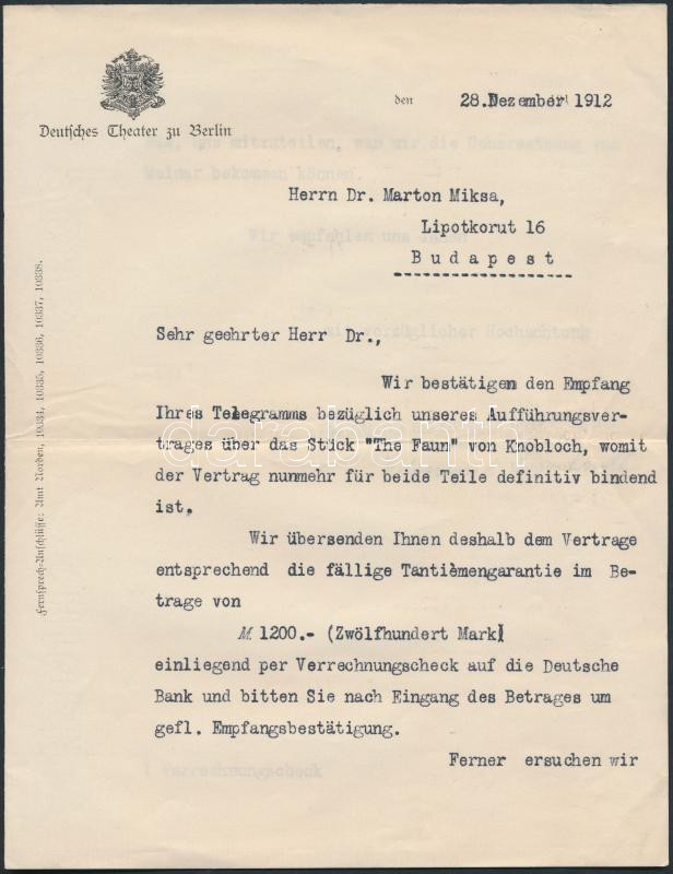 1912 Berlin, A Német Színház fejléces levele Edmund Reinhardt aláírásá...