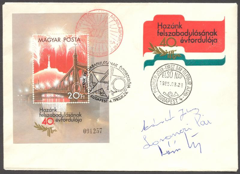 1985 Felszabadulás 40. évfordulója FDC az MSZMP XIII. kongresszusának ... https://www.darabanth.com/en/271-Online-auction/271.0/Other-collectibles/Autographs~19/1985-Felszabadulas-40-evforduloja-FDC-az-MSZMP-XIII-kongresszusanak-nyitonapi-belyegzojeve~II1318118