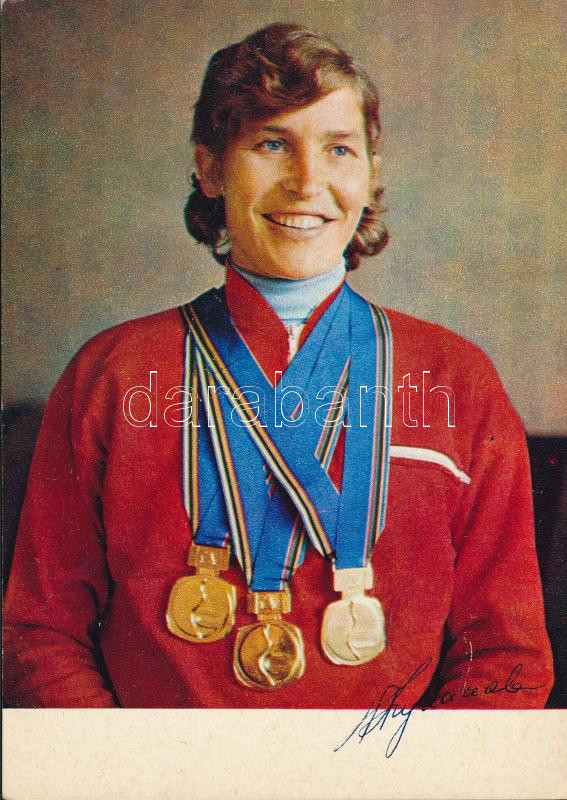 Galina Kulakova szovjet síelő nyomtatott aláírása őt magát ábrázoló fo...