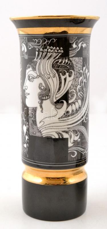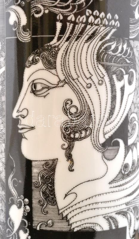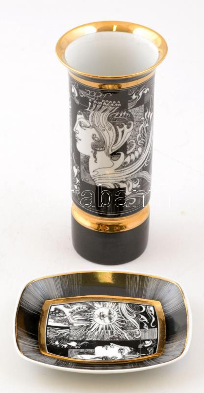 Hollóházi Szász Endre által tervezett porcelán váza és tálka, matricás...