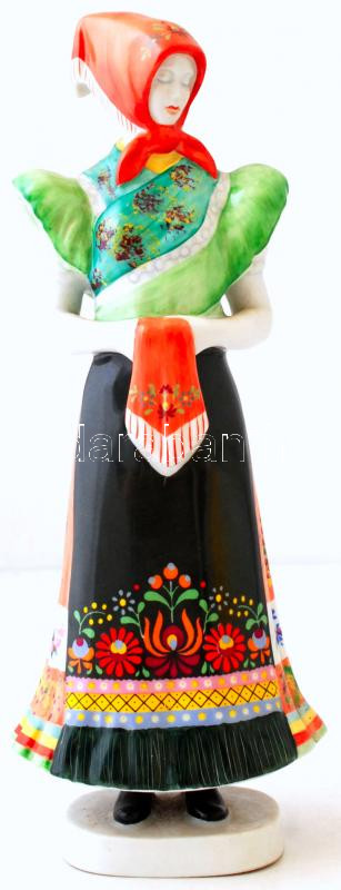 Hollóházi asszony népviseletben, kézzel festett, jelzett, alján apró mázhiba, m:28 cm