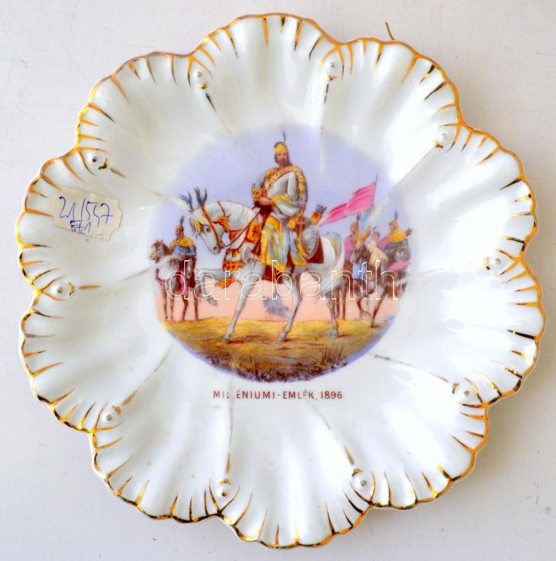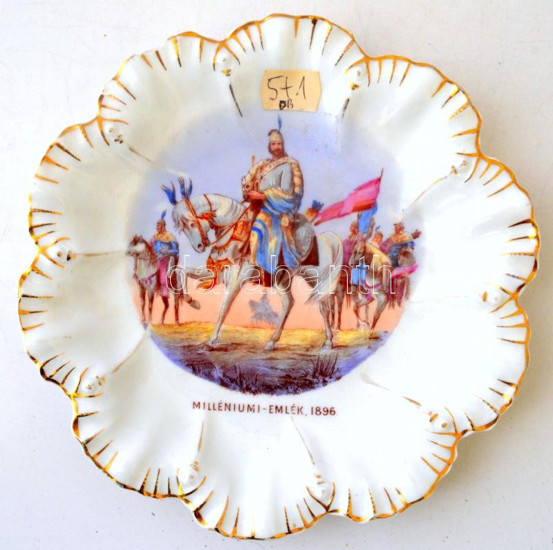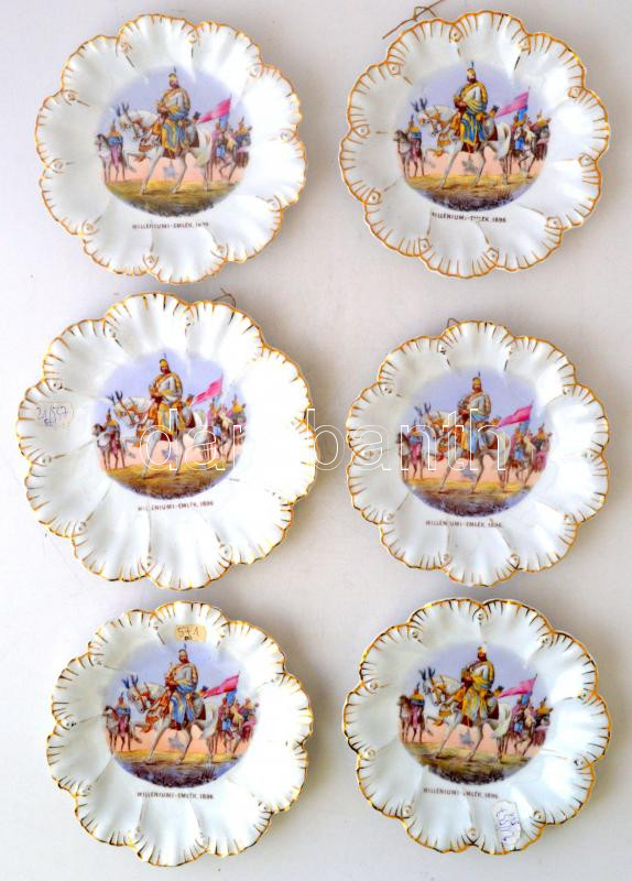 cca 1900 Tausek Ferencz Budapest 5+1 db. Milléniumi-emlék 1896 tányér, matricás, jelzett, kopásokkal, és lepatanásokkal, d: 20 cm., d: 23 cm.