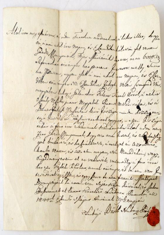 1844 Idősebb Hubay Pál kötelezvénye, mely szerint 6%-os kamatra kölcsönt kapott gazdasszonyától, viaszpecséttel