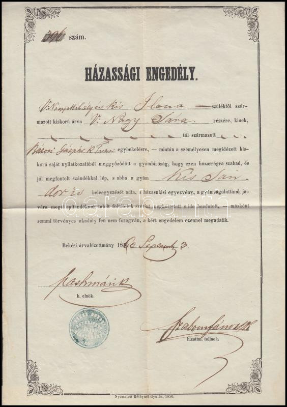 1860 a Békési Árvabizottmány házassági engedélye, a bizottmány bélyegz...