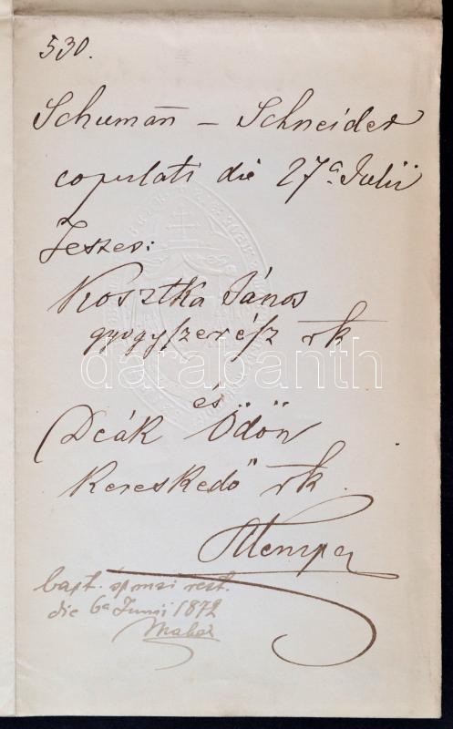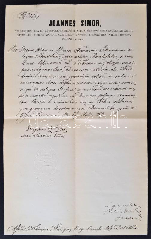 https://www.darabanth.com/en/271-Online-auction/271.0/Other-collectibles/Documents~17/1871-Simor-Janos1813-1891-esztergomi-ersek-vikariusa-altal-alairt-latin-nyelvu-hazassagle~II1371690