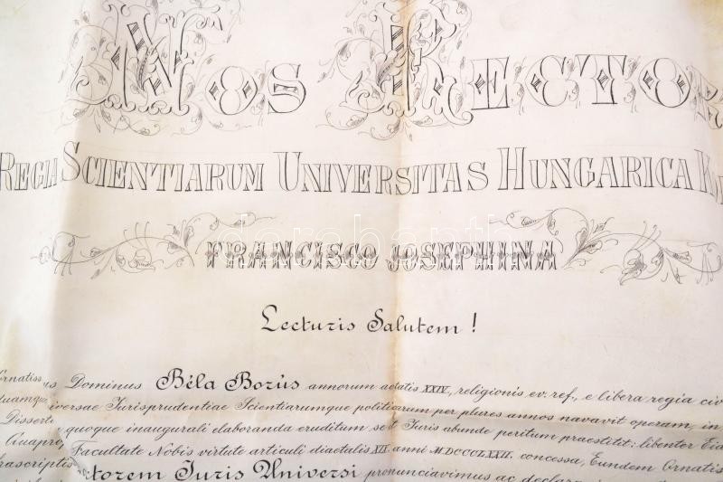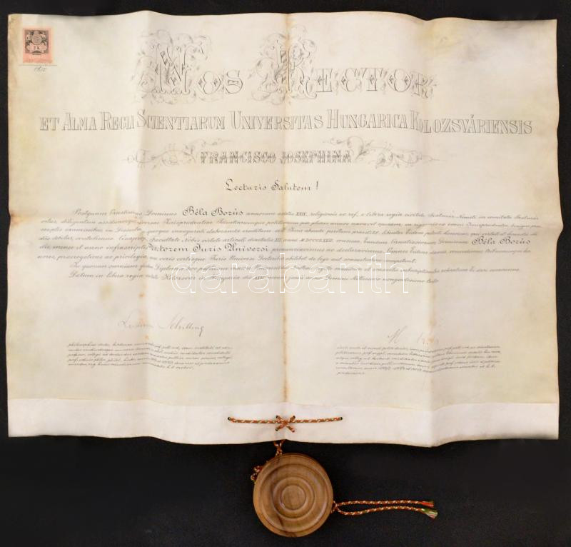 1902 "Nos Rector Et Alma Regia Scientiarum Universitas Hungarica Kolozsváriensis Francisco Josephina" kezdetű, Borús Béla nevére kiállÃtott jogi diploma, latin nyelven, fatokos függÅ‘ pecséttel, illetékbélyeggel.
