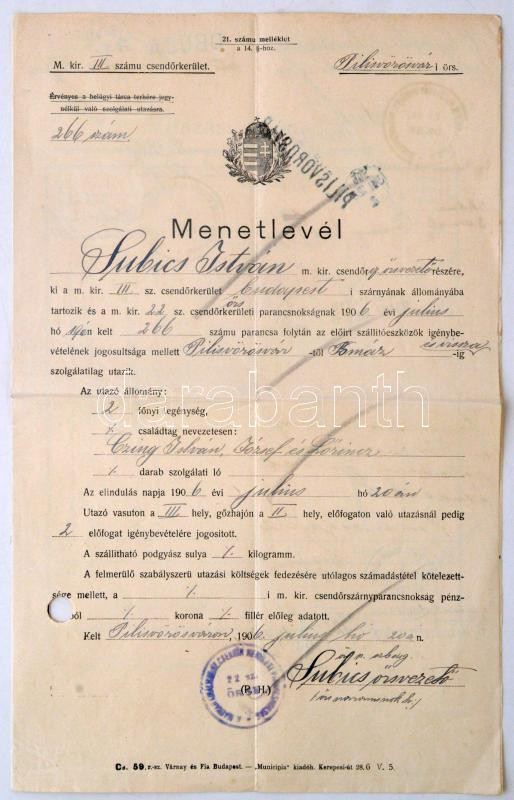 https://www.darabanth.com/en/271-Online-auction/271.0/Other-collectibles/Documents~17/1906-Menetlevel-m-kir-csendor-orvezeto-reszere-kilyukasztva-34x21cm~II1377054