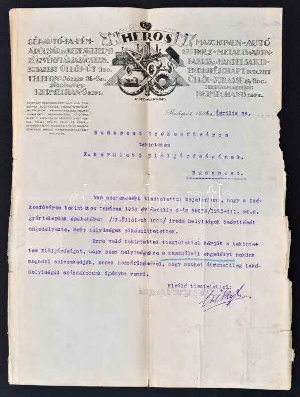 1924 Heros, Gép-autó-fa-fém árúgyár és kereskedelmi R.t, kérelme fejléces papíron sok okmánybélyeggel, oldalszélen töredezett, 30x22cm