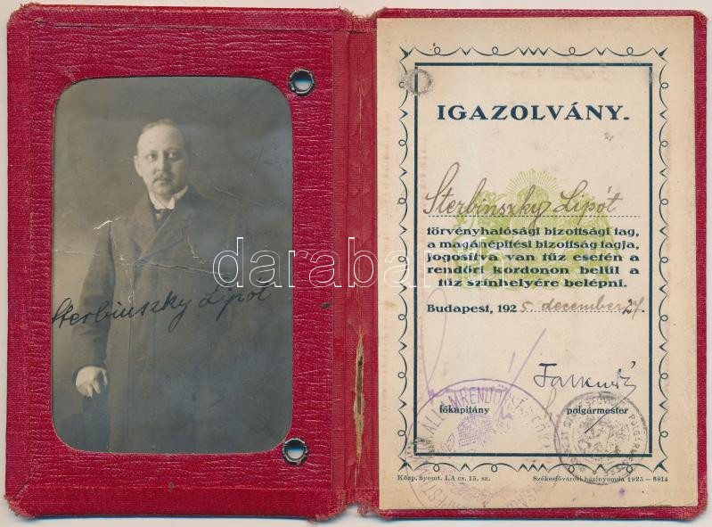1925 Igazolvány Sterbinszky Lipót Budapest főváros közgyűlés bizottság... https://www.darabanth.com/en/271-Online-auction/271.0/Other-collectibles/Documents~17/1925-Igazolvany-Sterbinszky-Lipot-Budapest-fovaros-kozgyules-bizottsagi-tag-reszere-kiall~II1274441