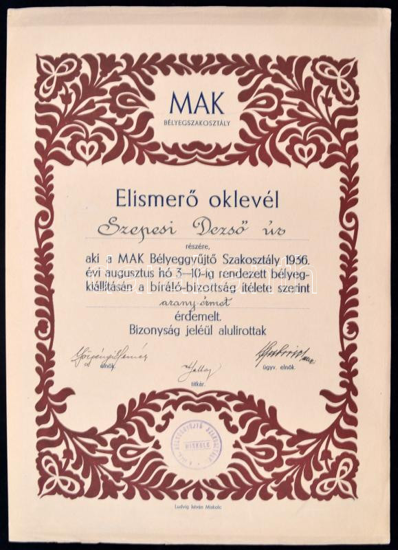 1936 MAK bélyeggyűjtő szakosztály bélyegkiállítás aranyéremről szóló oklevél