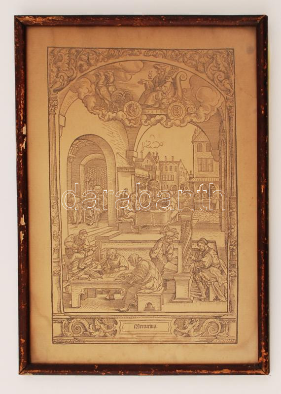 Description: cca 1820 Hans Sebald Beham (1500-1550) Merkúr gyermekei. Rotációs fametszet, papír, jelzés nélkül, üvegezett keretben. Foltos, kis szakadással. 25x35 cm. Egyes források szerint metszetet nem Beham, hanem Georg Pencz (cca. 1500-1550) készítette.