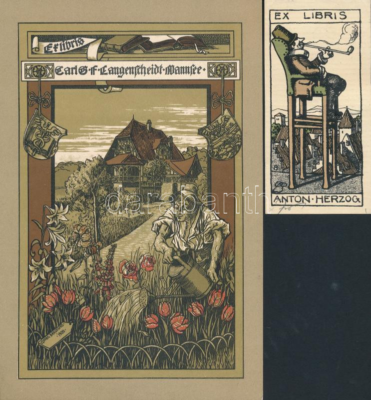 2 db ex libris (Georg Barlösius, Otto Barth), színes klisé, ill. színes litográfia, papír, az egyik jelzett, különböző méretben