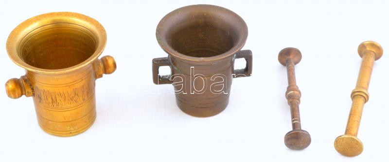 2 db. antik rézmozsár, törővel, mozsarak: m: 5.5 cm., m: 5 cm., törők: m: 8 cm, m: 7 cm.