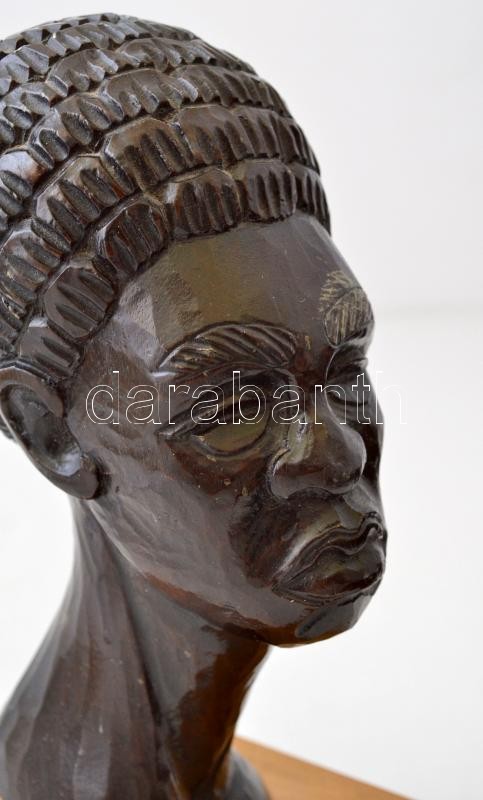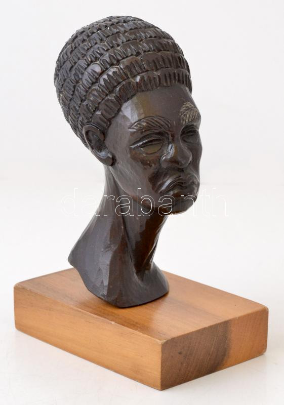 Bennszülött fej, nemes fából faragva, fa talapzaton, m: 18 cm