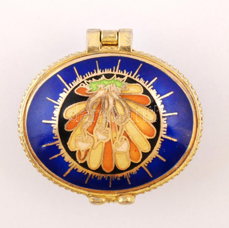 Gyógyszertartó fedeles szelence rekeszzománc díszítéssel, 4x3x2 cm
