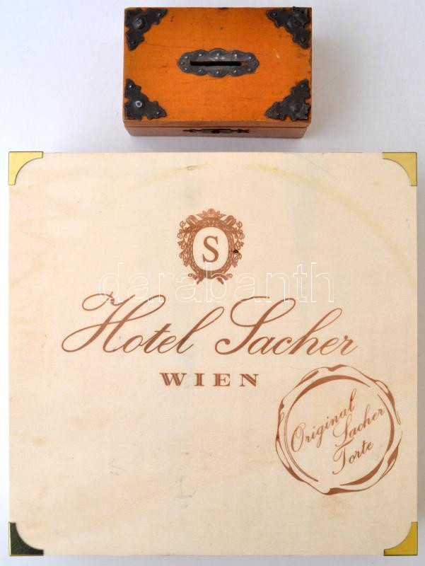 "Hotel Sacher Wien" fa doboz, szép állapotban, 24x24x6,5 cm + fa persely kulcs nélkül, 11x7x5 cm
