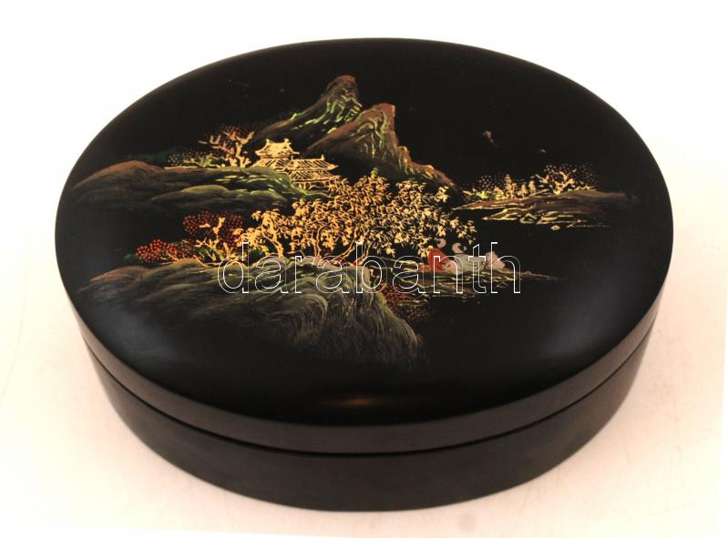 Keleti látképes lakkozott ovális fadoboz, apró kopásnyomokkal, az aljá...