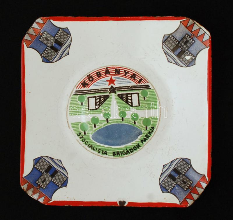 "Kőbányai Szocialista Brigádok Parkja" feliratú zománcozott fém hamutartó, lepattanásokkal, 15×15 cm