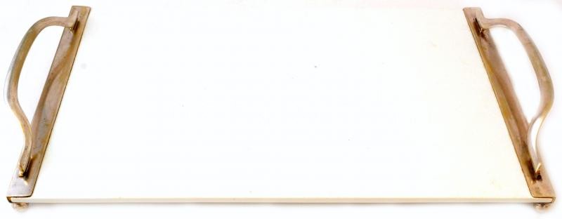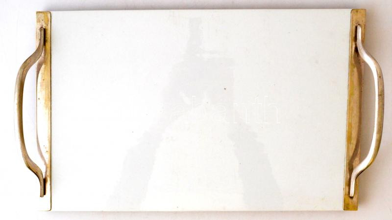 Mázas fajansz edényalátét, ezüstszínű fém fogantyúkkal, 40x25x5 cm