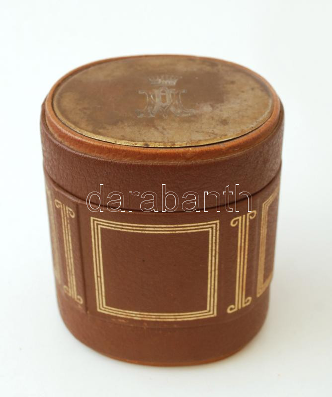 Ovális bőr doboz, tetején monogramos réz betéttel, apró hibákkal, 11x9...